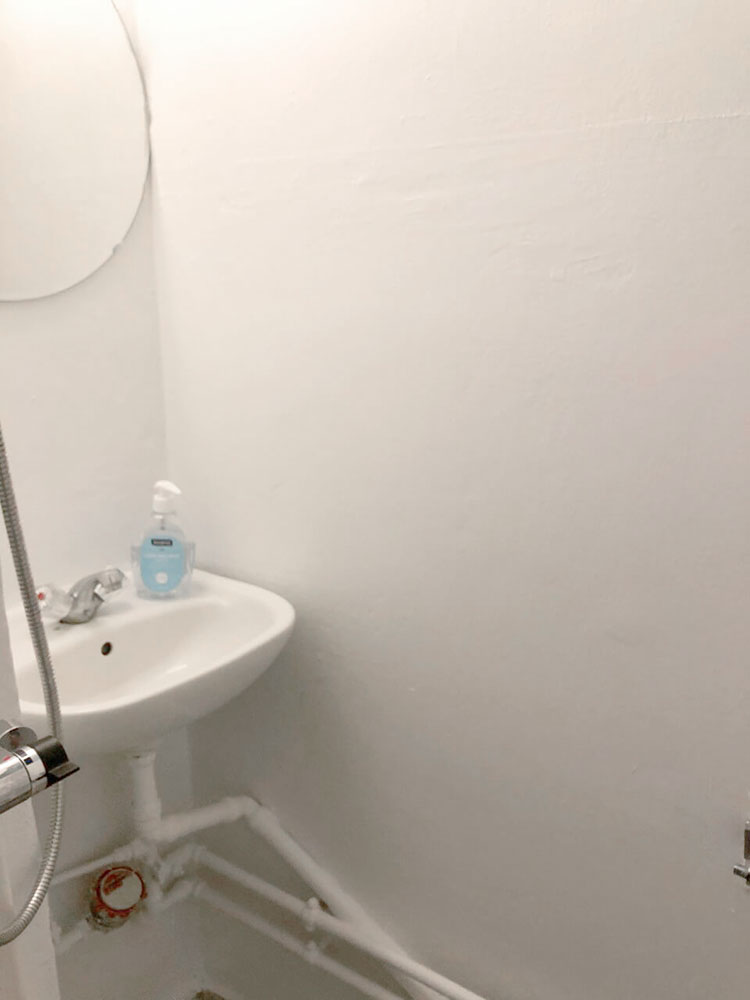 Soveværelset er ligeledes stort og rummeligt med stort vinduesparti og masser af vægplads til skabe eller kommoder. Lejlighedens badeværelse er småt, men brugbart og med bruser.