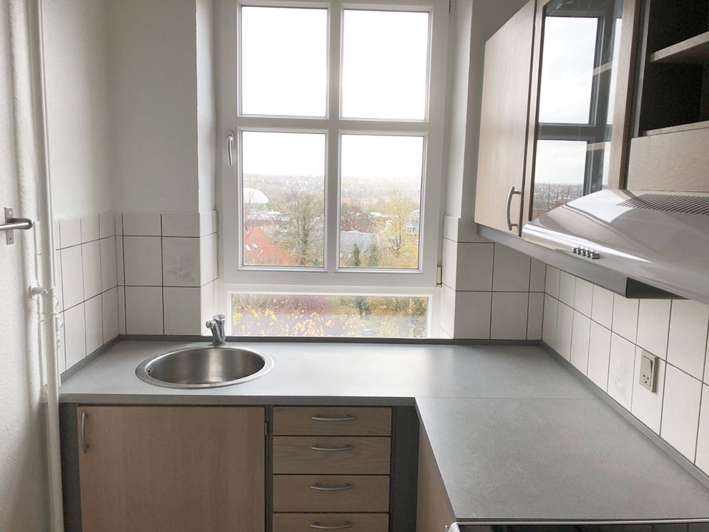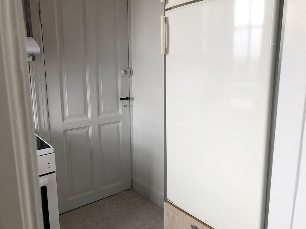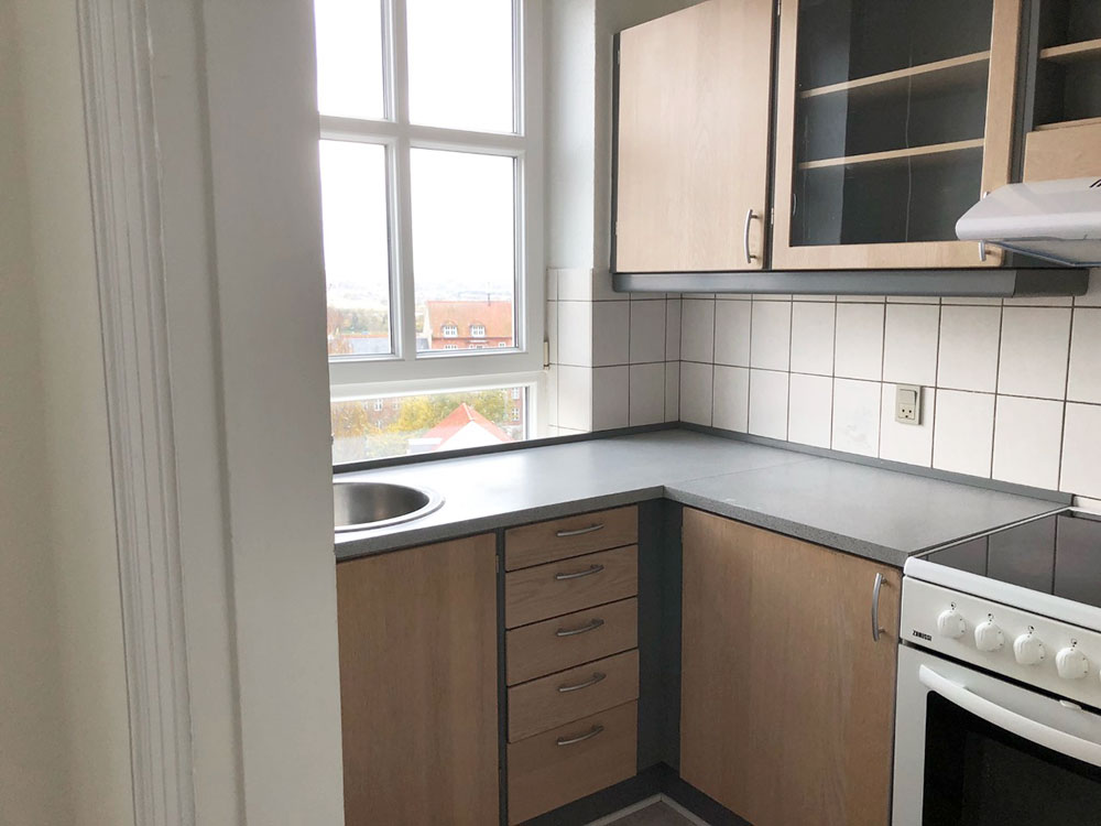 Denne lejlighed består af et mindre køkken der er af ældre dato, men funktionelt. Har vinyl på gulvet, stort vinduesparti som har en fantastisk udsigt ud over hustage og trætoppe samt udgang til bagtrappen.