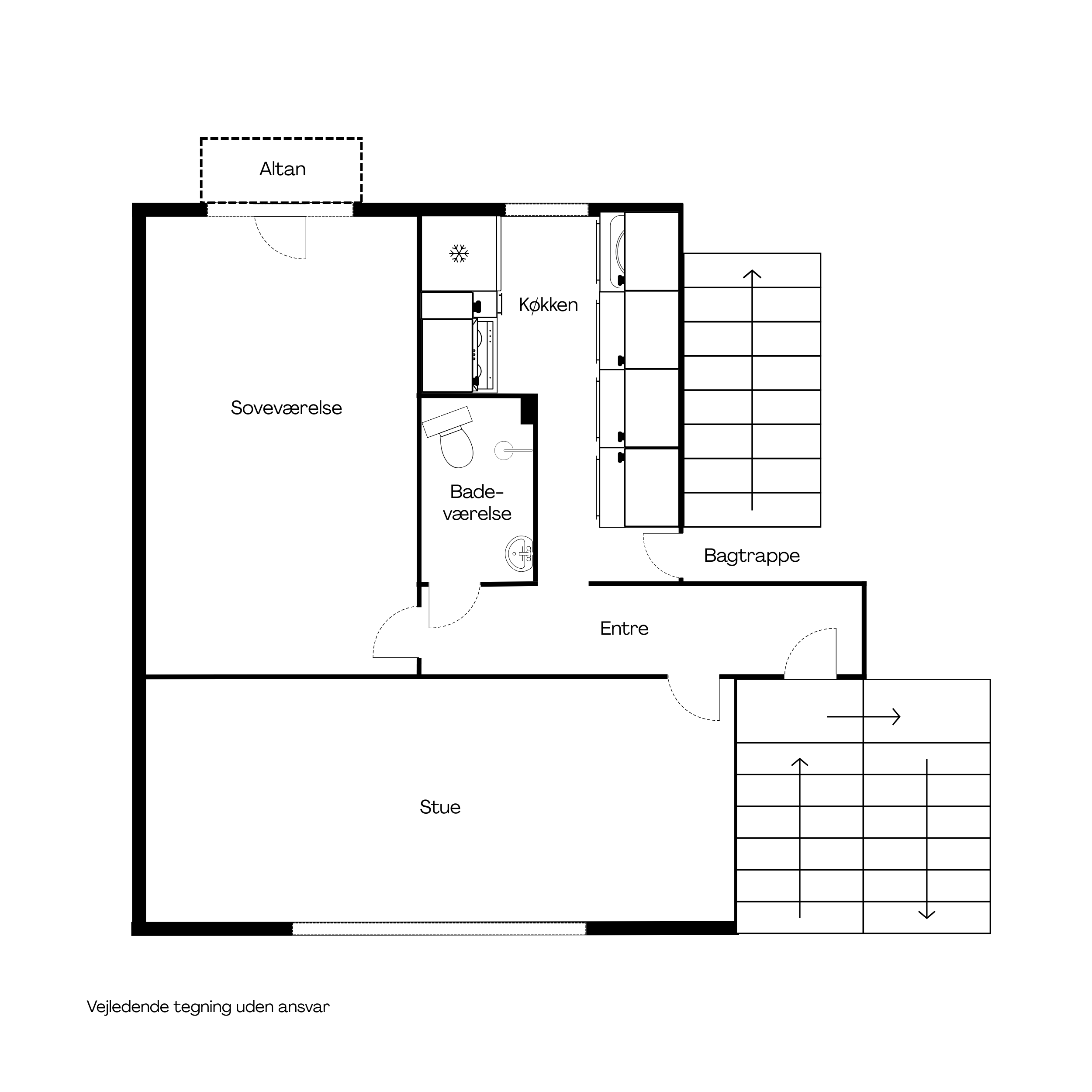 Køkkenet er med masser af over- og underskabe, udsigt til det grønne område og udgang til bagtrappen. Det er af ældre dato, men funktionelt. Lejligheden har et mindre badeværelse.