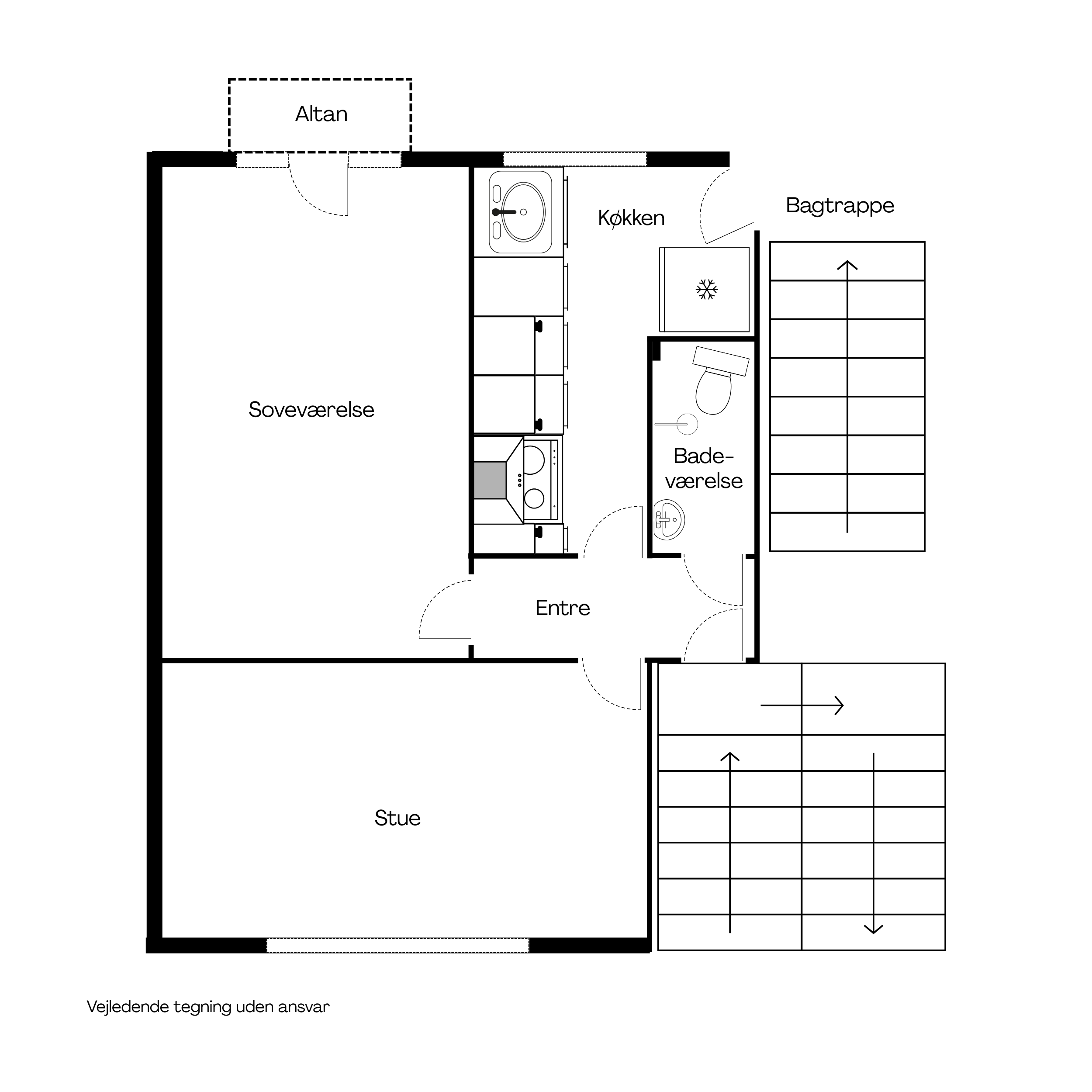 For enden af entreen ligger det store rummelige soveværelse som har udgang til lejlighedens altan. Ligeledes er der afhøvlede gulve og der er masser af plads til kommoder eller skabe.