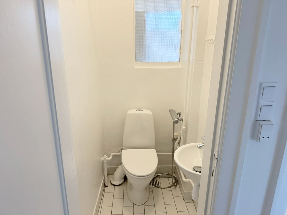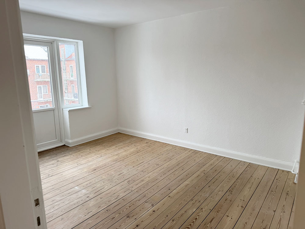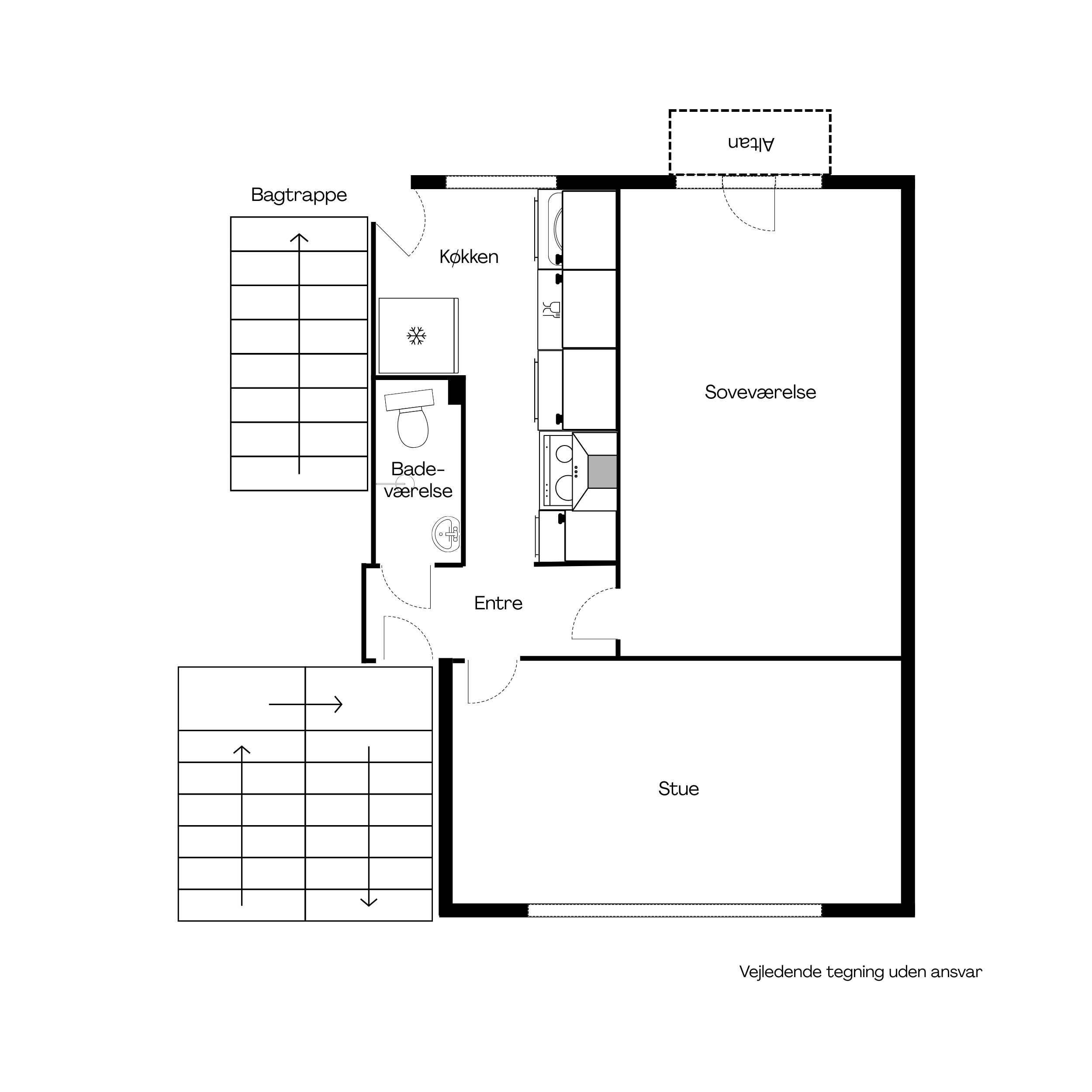 Lejlighedens entre grener ud til alle af lejlighedens 4 rum. Lige frem for indgangen ligger lejlighedens badeværelse som er lille men funktionel. Næste efter kommer et lille hyggeligt køkken med opvaskemaskine og udgang til bagtrappen.
