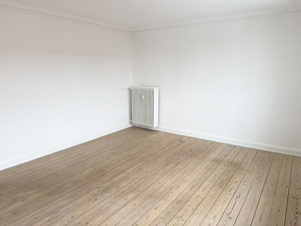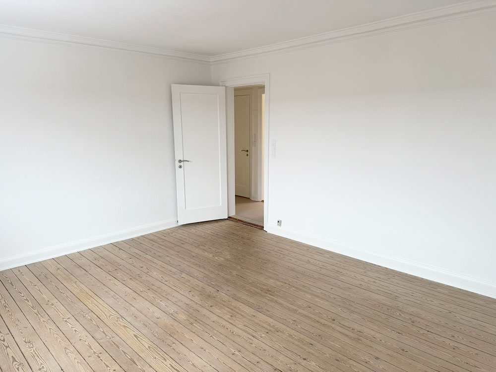 Videre ind ligger den store rummelige stue som har afhøvlede gulve, stuk og rosette til lampeudtag. Stuen vil sagtens kunne rumme måde sofa- og spisebordsområde. Soveværelset er ligeledes stort og rummeligt og har udgang til lejlighedens altan.