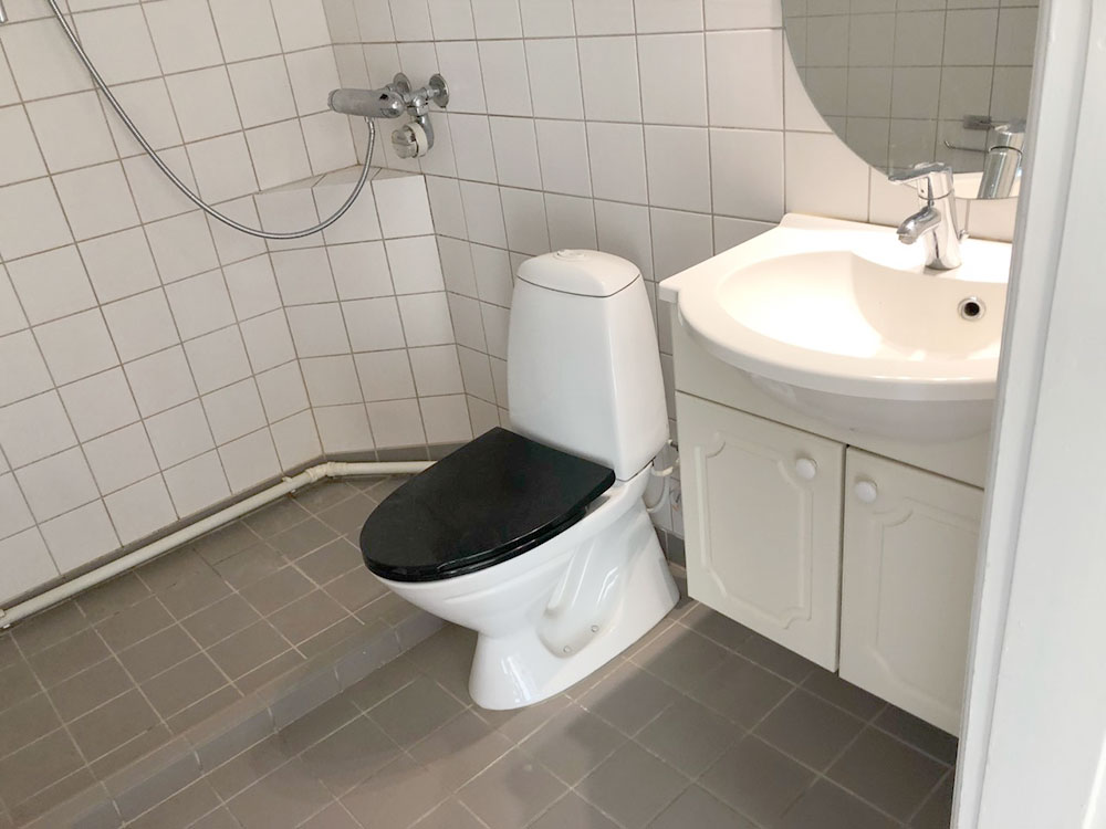 Lejlighedens badeværelse er rummeligt og med god belysning. Skabsplads under håndvasken, rummelig bruseniche og der er mulighed for at installerer egen vaskemaskine og kondenstørretumbler.