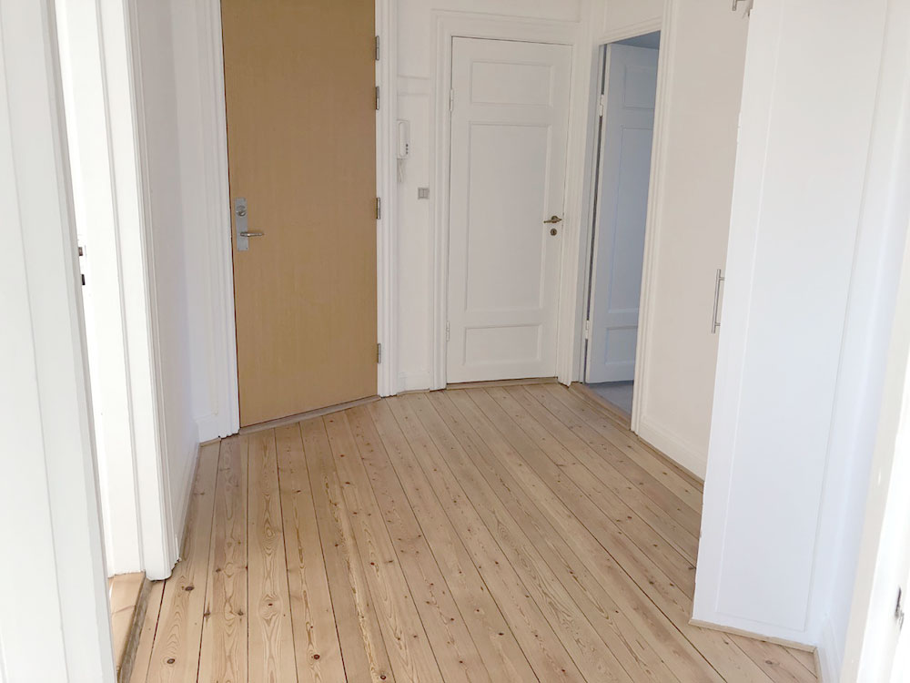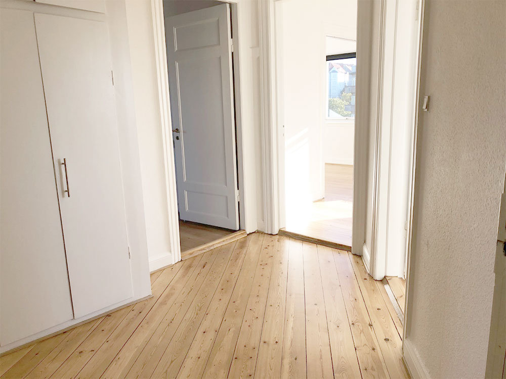 I vil blive budt velkommen af en rummelig entre med indbygget skabe. Entreen grener ud til 4 af lejlighedens 5 rum.