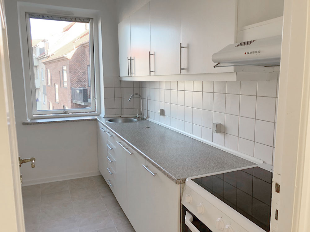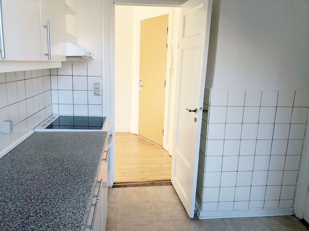 Dejlig køkken med masser af over- og underskabe, ydermere udgang til bagtrappen.
